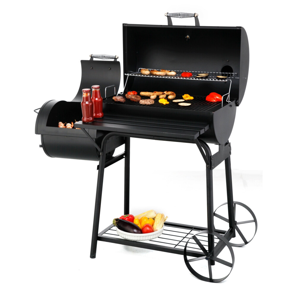 Barrel Charcoal Grill with Offset Smoker, AllMetal Design, Large Cooking Area, Side Table and Wheels for Outdoor Gardening, Black