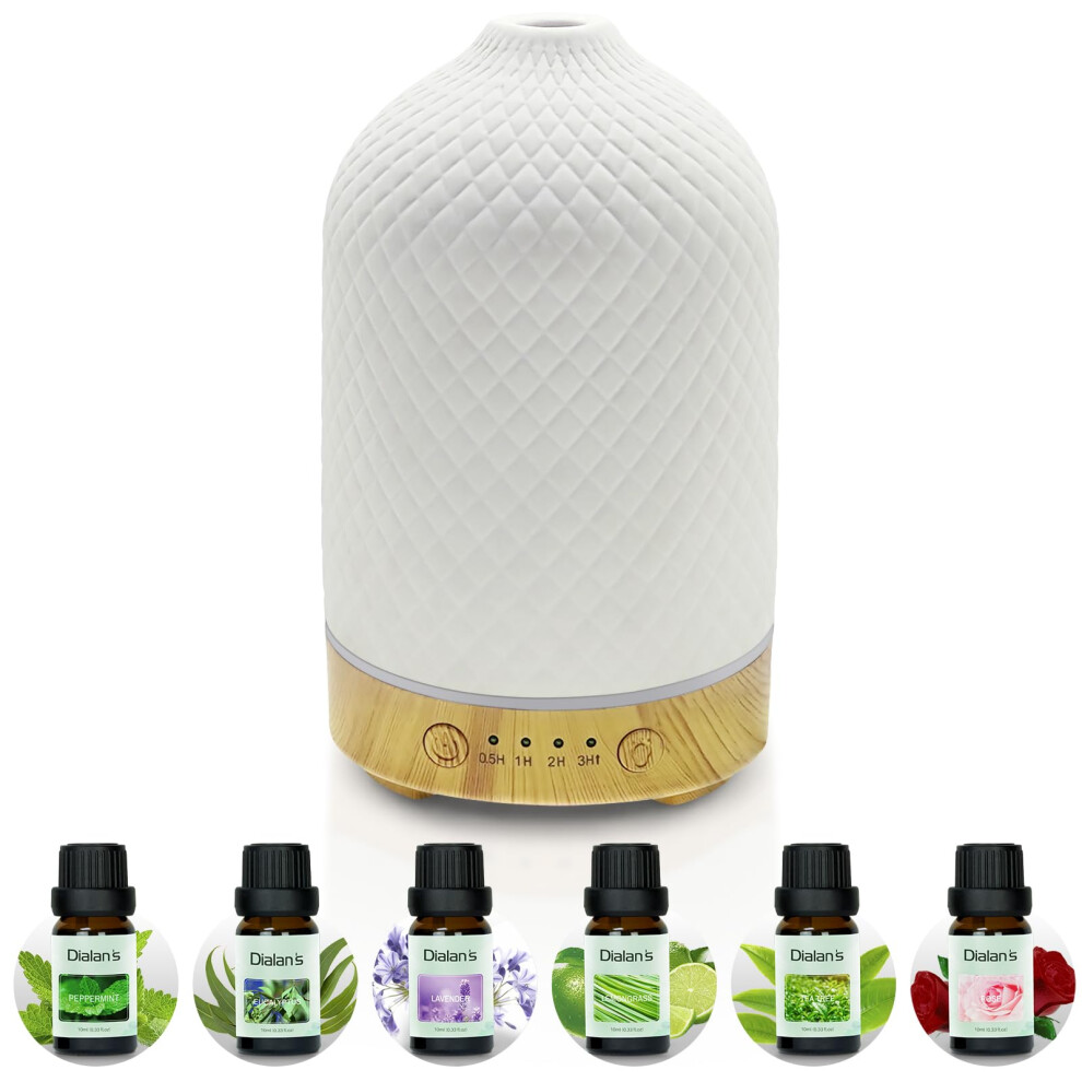 Ceramic Essential Oil Diffuser Electric Aroma Diffuser with 6 Pcs*10ml Essential Oil Gift Set, 7 Colors LED Light/4 Timers Modes/Auto-Shut Off 200ml for Home/Office/Spa