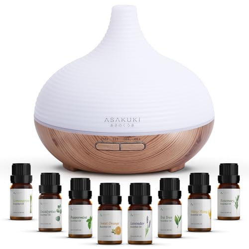ASAKUKI 300ml Essential Oil Diffuser with 8 Oils, Wood Grain Oil Diffusers with 7 Colour Mood Lights, Auto Shut-Off & Timer, Ultrasonic Quiet Humidifier for Home, Bedroom or Office