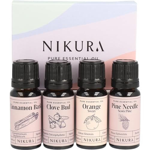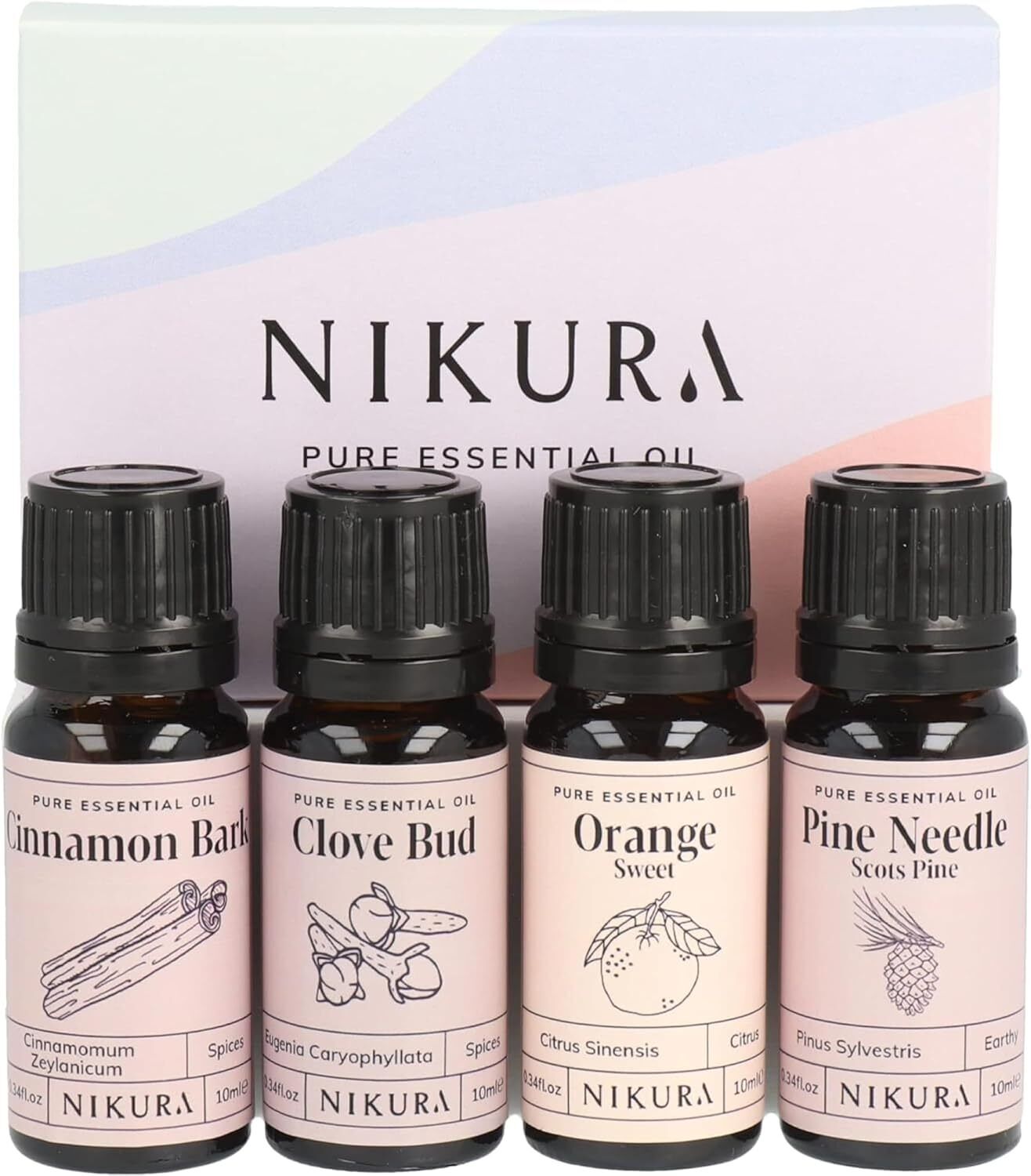 Nikura Winter Essential Oil Gift Set - 4 x 10ml | Essential Oils for Diffusers for Home, Aromatherapy, Clean Home | Cinnamon, Clove, Sweet Orange, Pine Needle | UK Made
