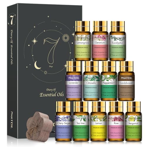 PHATOIL Premium Essential Oils Set with Wood Diffuser, Pure Natural Scent Fragrance Oil Gift Set-12 Pack/5ml for Relaxation, Aromatherapy, Diffusers, Humidifier