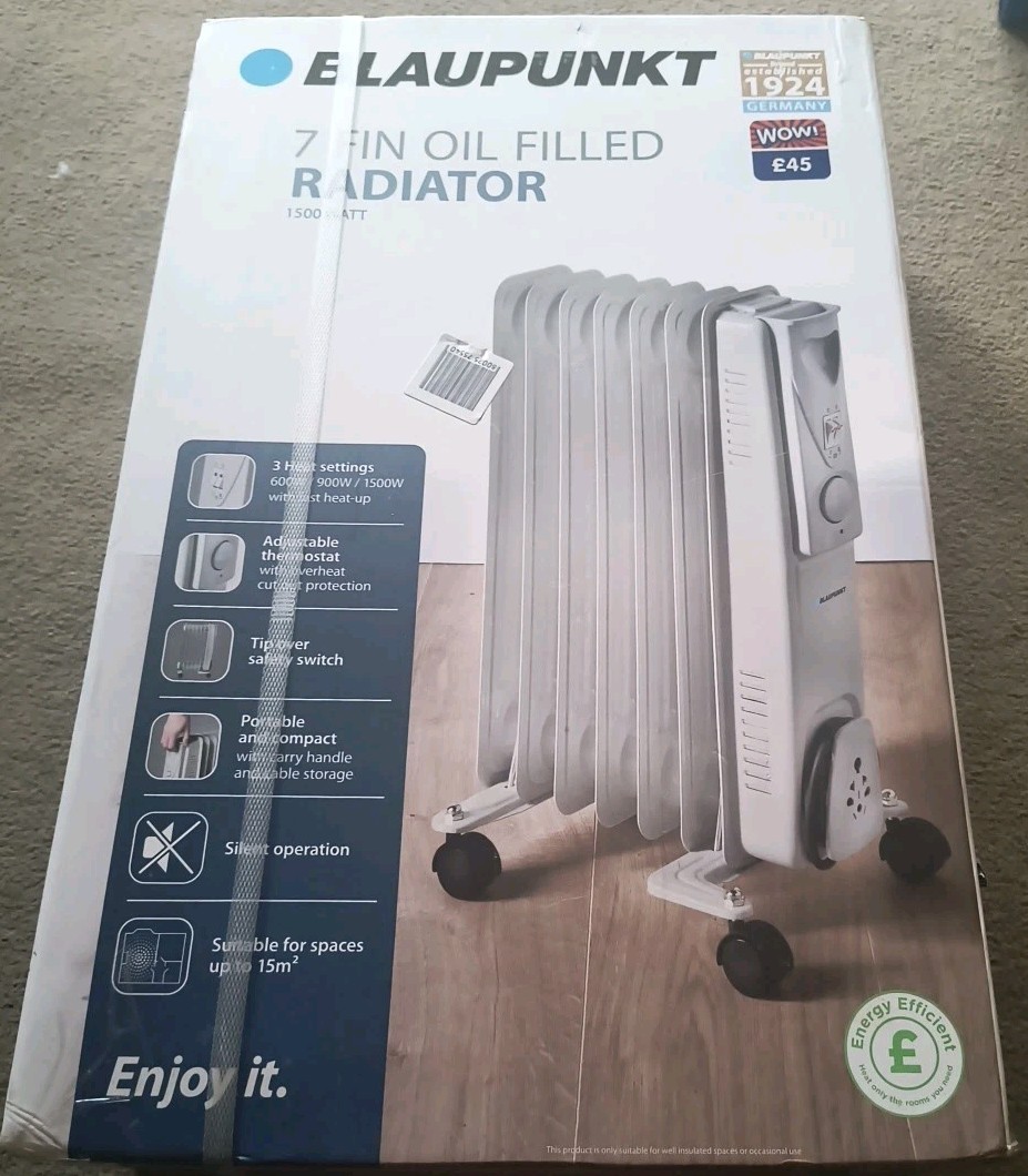 7 Fin Portable Oil Filled Radiator Heater Thermostat 3 Heat Setting Corded 1.5kw
