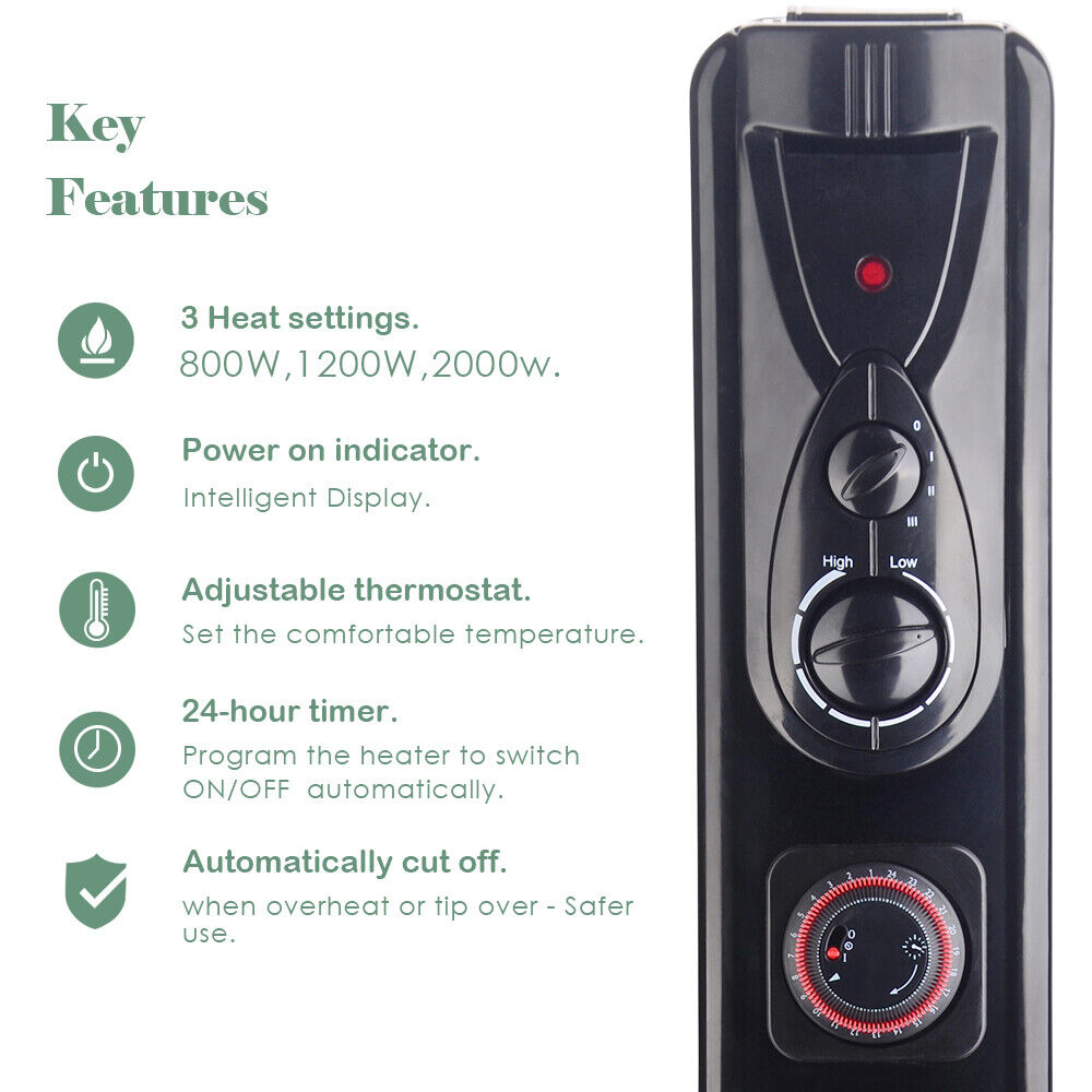 9 Fin 2000W Portable Electric Oil Filled Radiator Heater With Timer Gloss Black