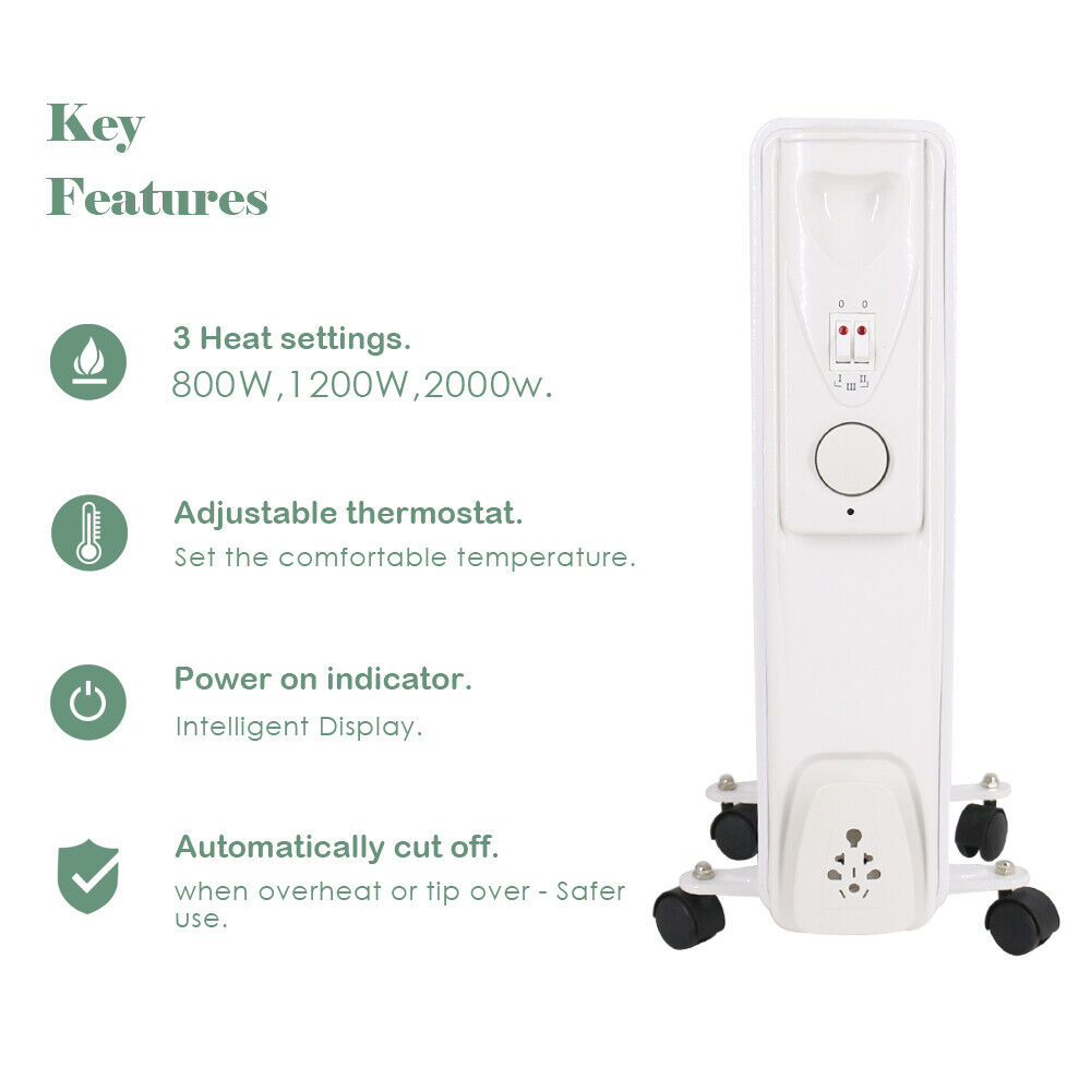 2000W 9 Fin Portable Electric Slim Oil Filled Radiator Heater with Adjustable Temperature- White