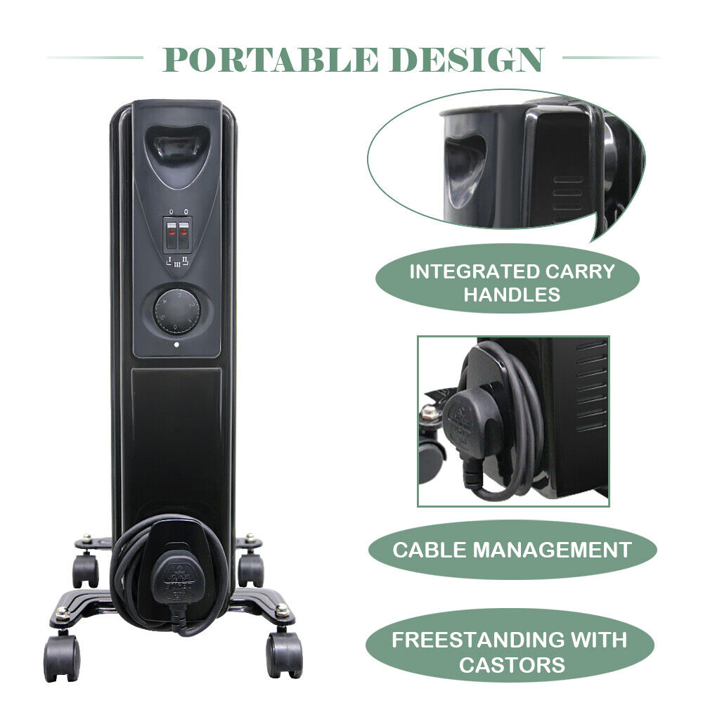 Portable Oil Filled Radiator Electric Heater Thermostat 7 Fin 1500W Gloss Black