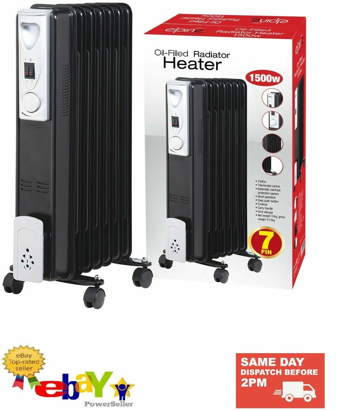 1500W 7 FIN PORTABLE OIL FILLED RADIATOR HEATER ELECTRICAL CARAVAN OFFICE BLACK