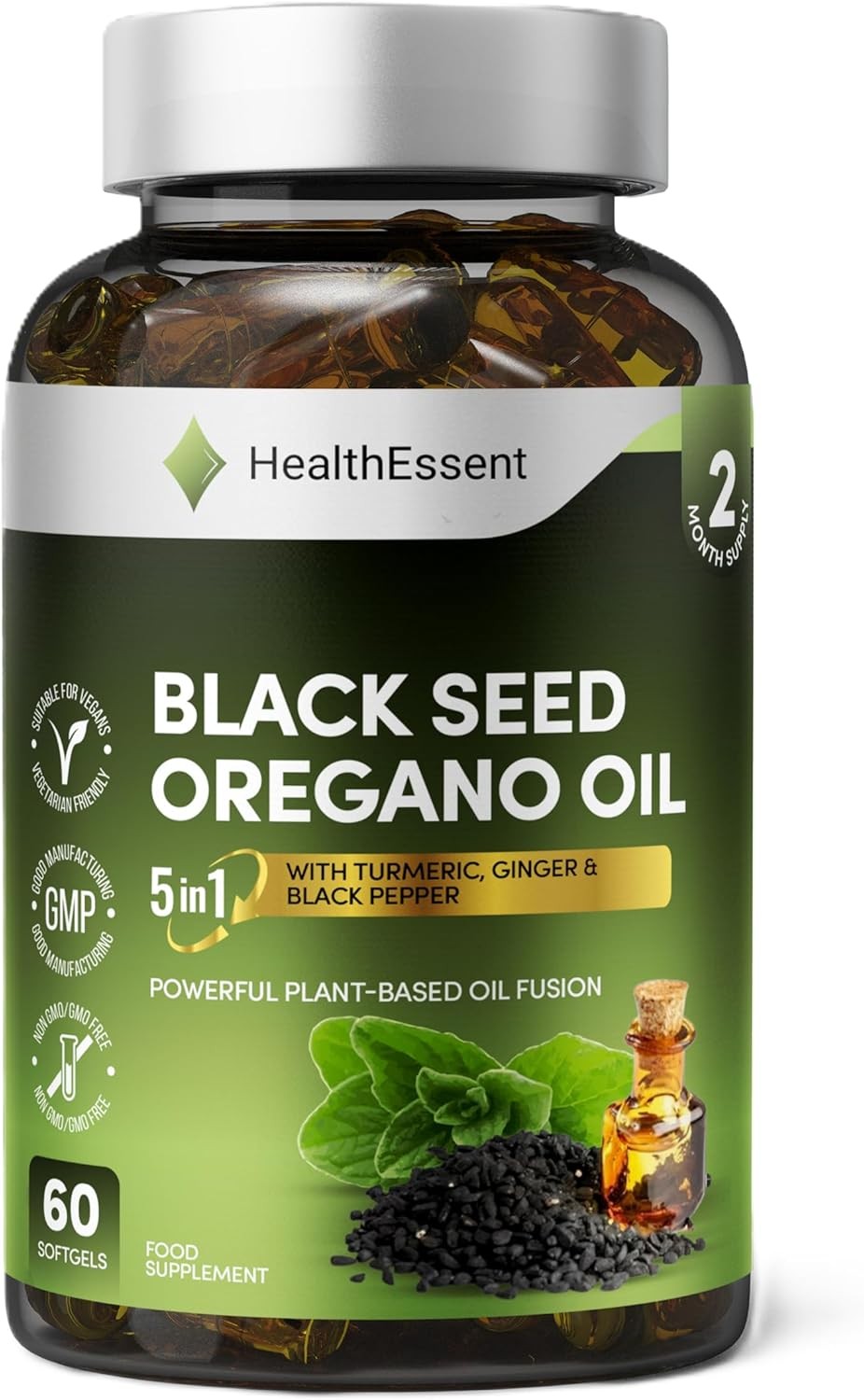 HealthEssent Oil of Oregano with Black Seed Oil 6500mg Complex - 5-in-1 Blend w