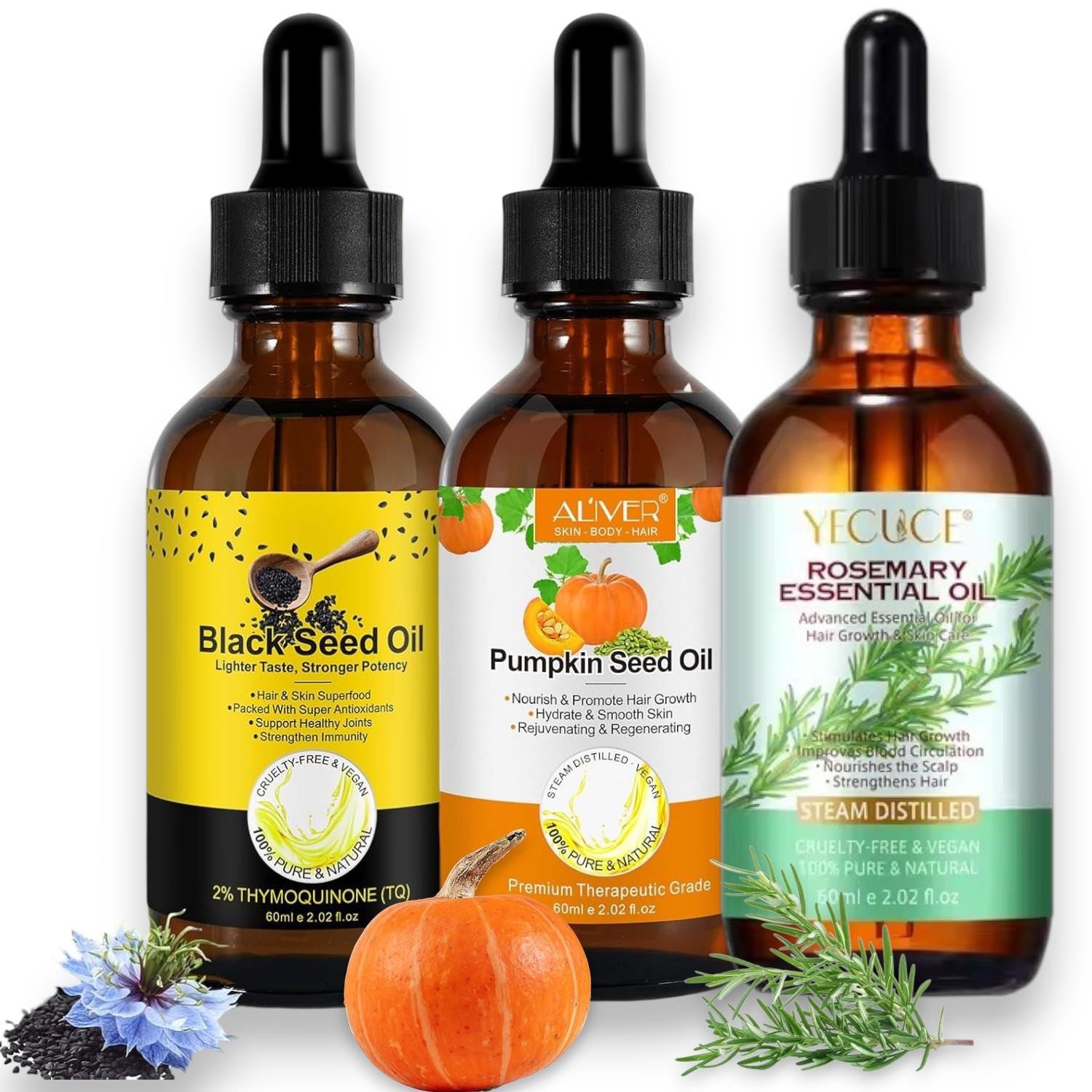 Organic Hair & Skin Care Oil Trio Rosemary, Pumpkin Seed & Black Seed Vegan