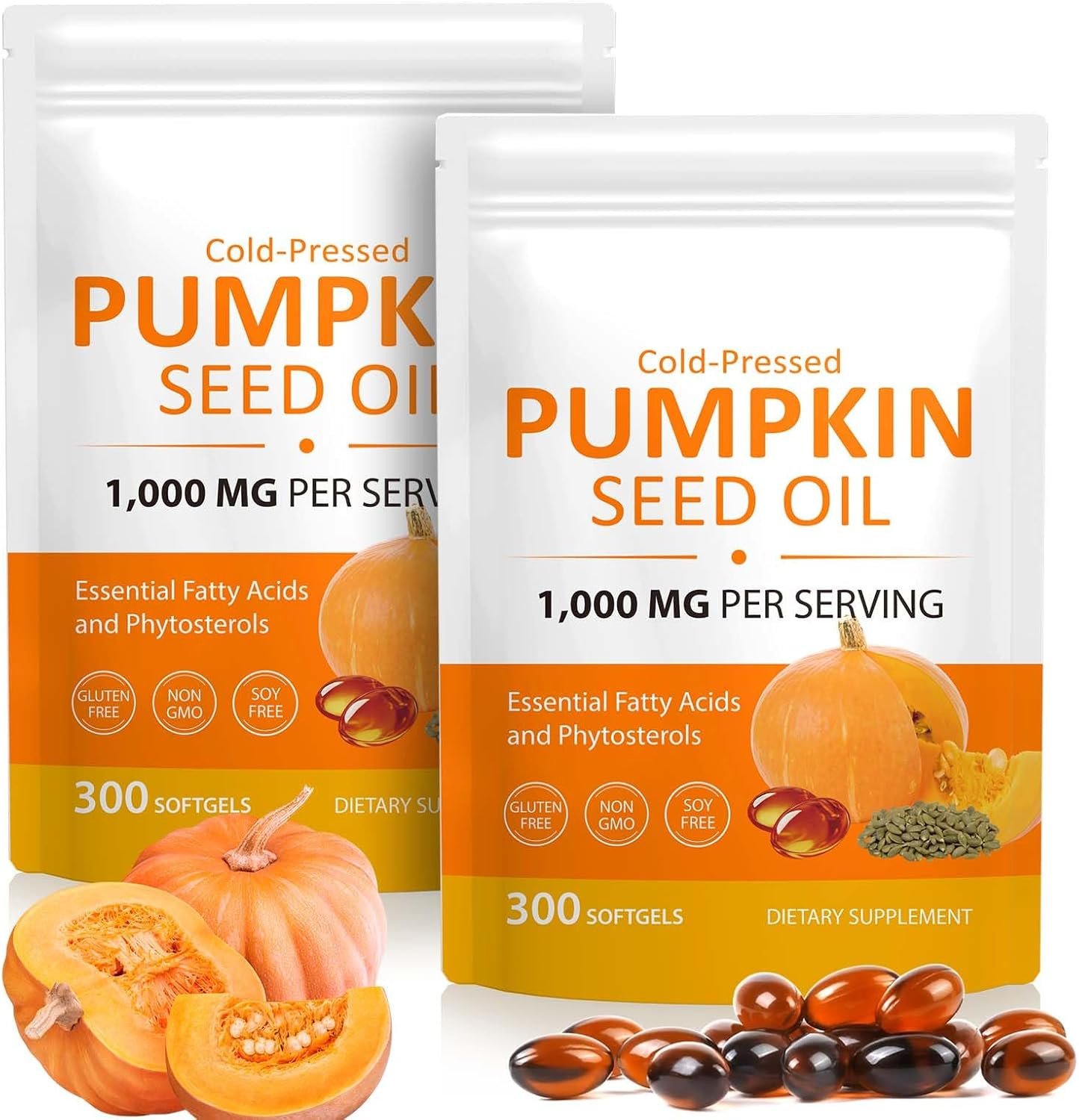Pumpkin Seed Oil Capsules - 1000mg per Softgels, Cold Pressed & Efficient Absorption, Essential Fatty Acids & Phytosterols & Supports Hair Growth, Urinary, 300 Softgels 2bag.