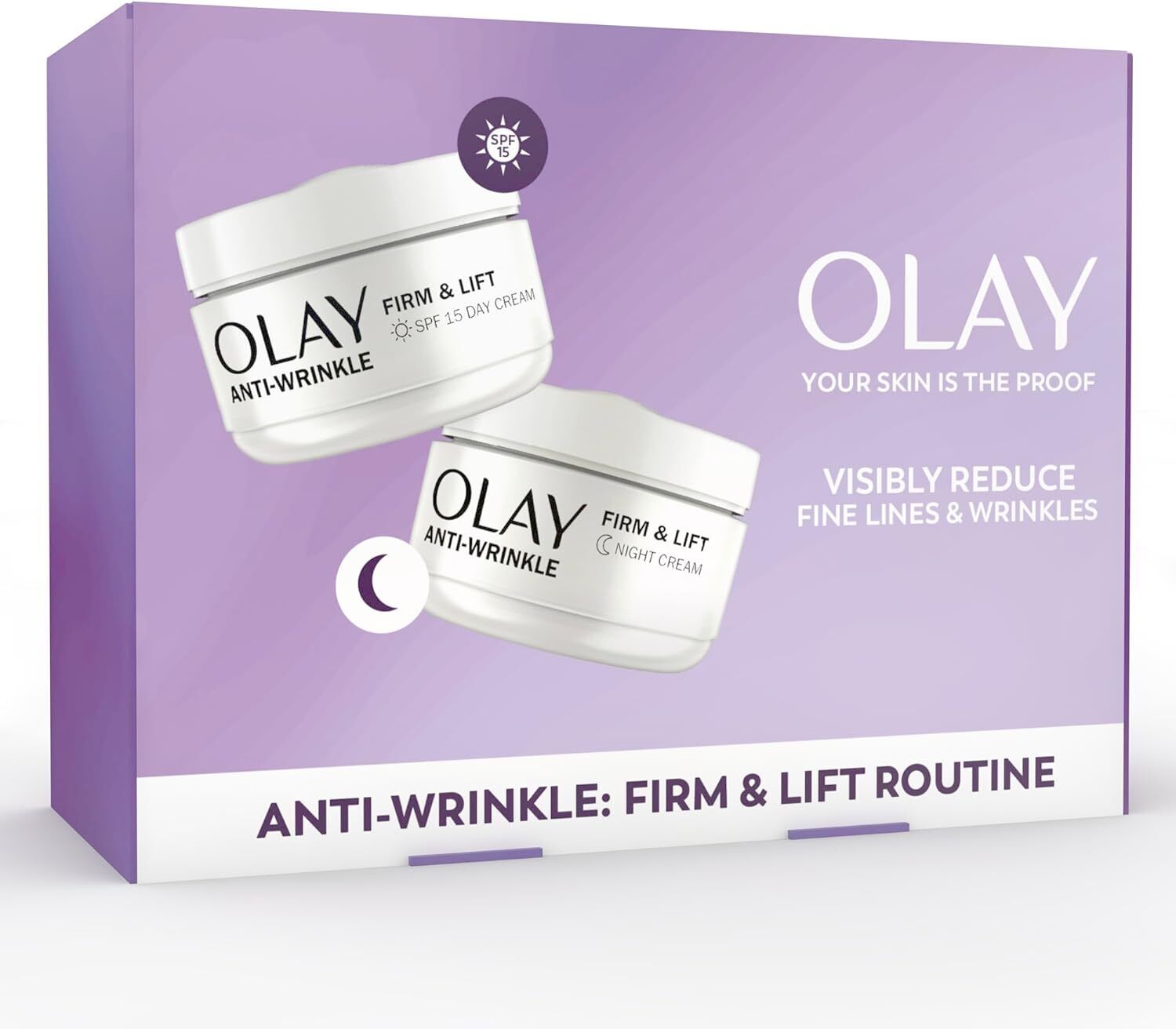 Olay Anti-Wrinkle Firm & Lift Giftset: SPF15 Day Face Cream 50ml + Night Cream Moisturiser 50ml, Anti-Ageing Skin Care