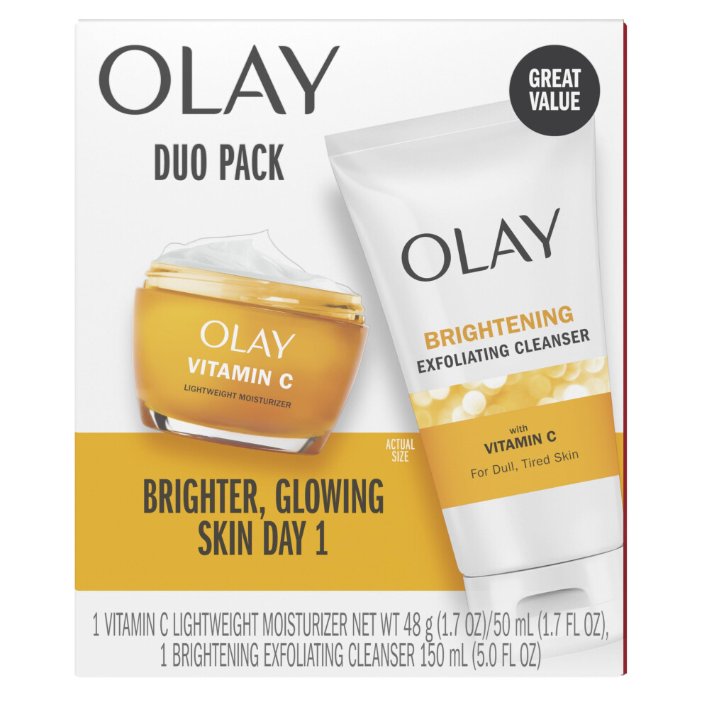 Olay Vitamin C Duo Pack, Brightening Exfoliating Cleanser 150 ml, Lightweight Moisturizer 50 ml, 4 Count Vit Cleansing Melts