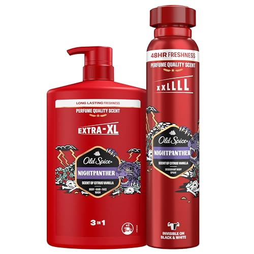 Bundle of Old Spice Night Panther Men’s Shower Gel & Shampoo 1000ml Multi-Use 3-in-1 Hair-Face-Body Wash. Long Lasting Fresh, Perfume Quality Scent + Nightpanther Spray 250ml