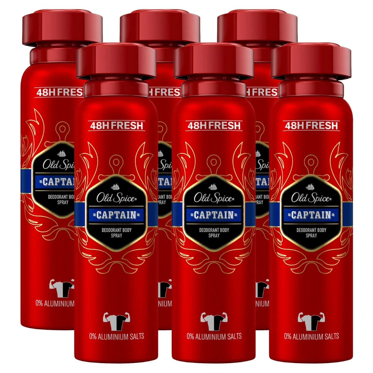 Old Spice Captain Deodorant Body Spray For Men 150 ml, 48H Fresh, 0 Percent Aluminium Salts, Anti-White Marks and Yellow Stains x6