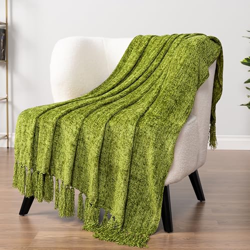 PAVILIA Olive Green Throw Blanket for Couch - Soft Chenille with Tassel for Sofa Bed, Chair, Living Room - 50x60