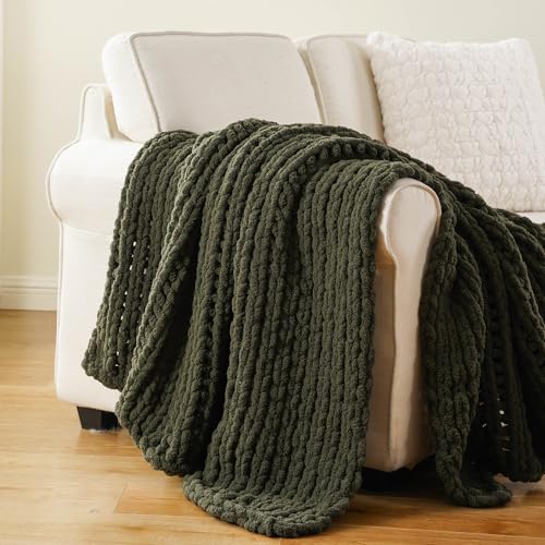 WESHIONGOO Chunky Knit Blanket Throw 50"×60" Knitted Throw Blankets for Couch Bed Fluffy Soft Blanket with Jumbo Chenille Yarn Thick 100% Handmade (Olive Green)
