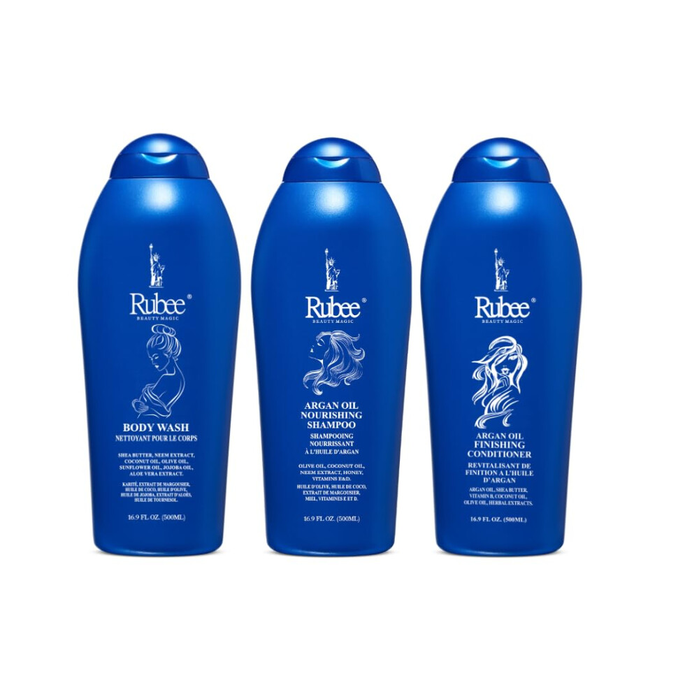 Rubee Pack of 3 Shampoo and Conditioner with Body Wash - with Hair Growth Formula - Shea Butter Argan Oil and Olive Oil - Hair Care for Curly Oily