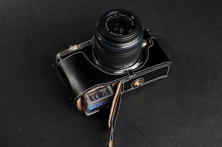 Real Leather Full Camera Case Bag Cover for Olympus EP5 E-P5 14-42mm Lens Black