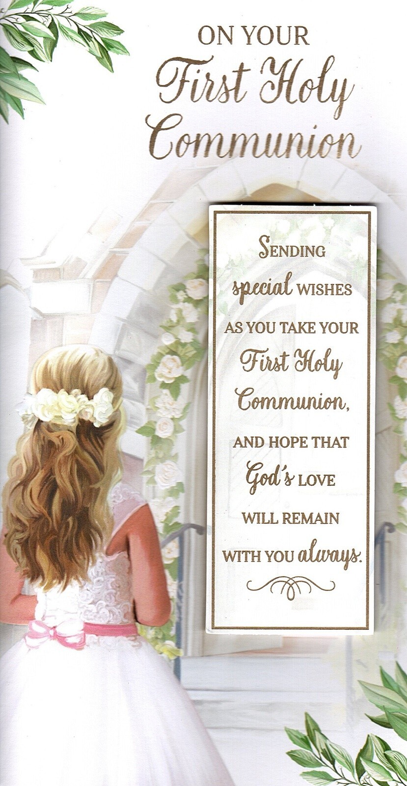 On Your First Holy Communion Card Girl Approaching Chapel Raised Verse Gold Foil