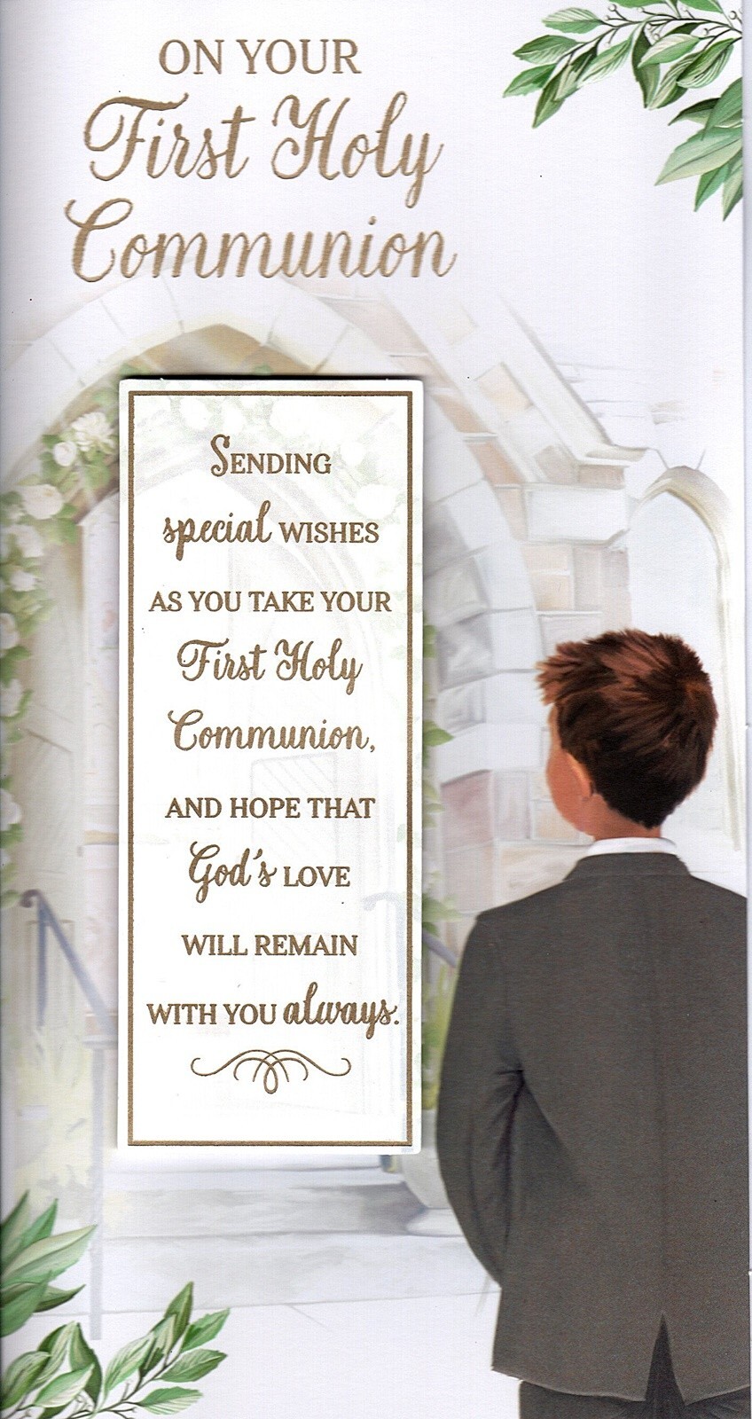On Your First Holy Communion Card Boy Approaching Chapel Raised Verse Gold Foil