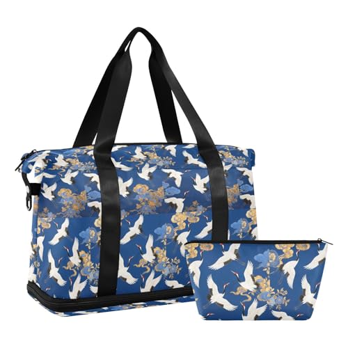 Waterproof Tote Bag Blue and Golden Japanese Cloud Crane Gym Carry on Duffel Bags with Toiletry Bag for Airplane Traveling