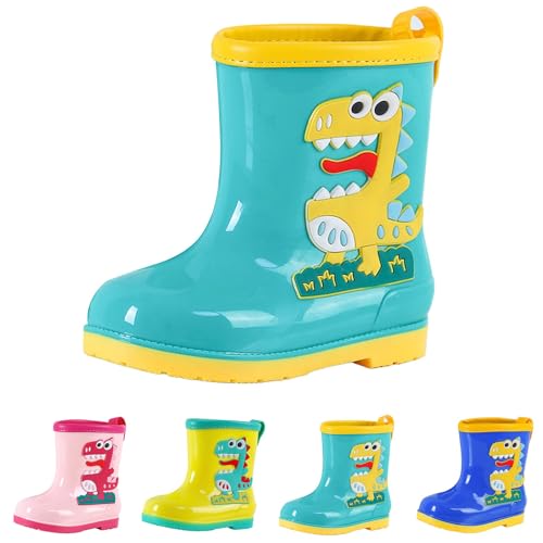 Kids Dinosaur Rain Boots Boys Girls Soft Rubber Sole Wellies Boots Waterproof Non-Slip Cute Wellington Rain Shoes Outdoor Running Walking Easy Pull On Shoes (Green, 2-3 Years)