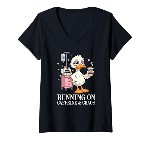 Women's Nurse Shift Exhaustion Humor Joke Running on Caffeine Chaos V-Neck T-Shirt
