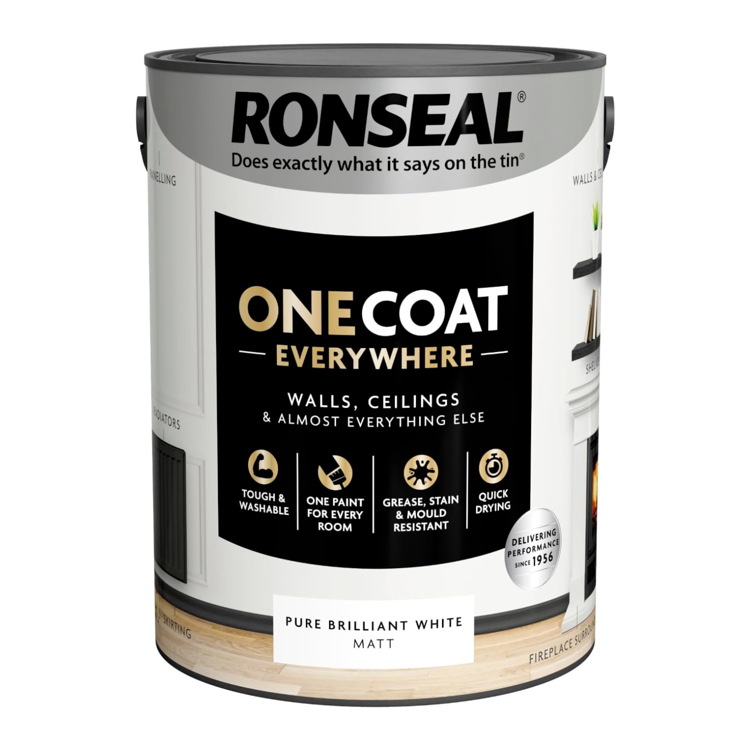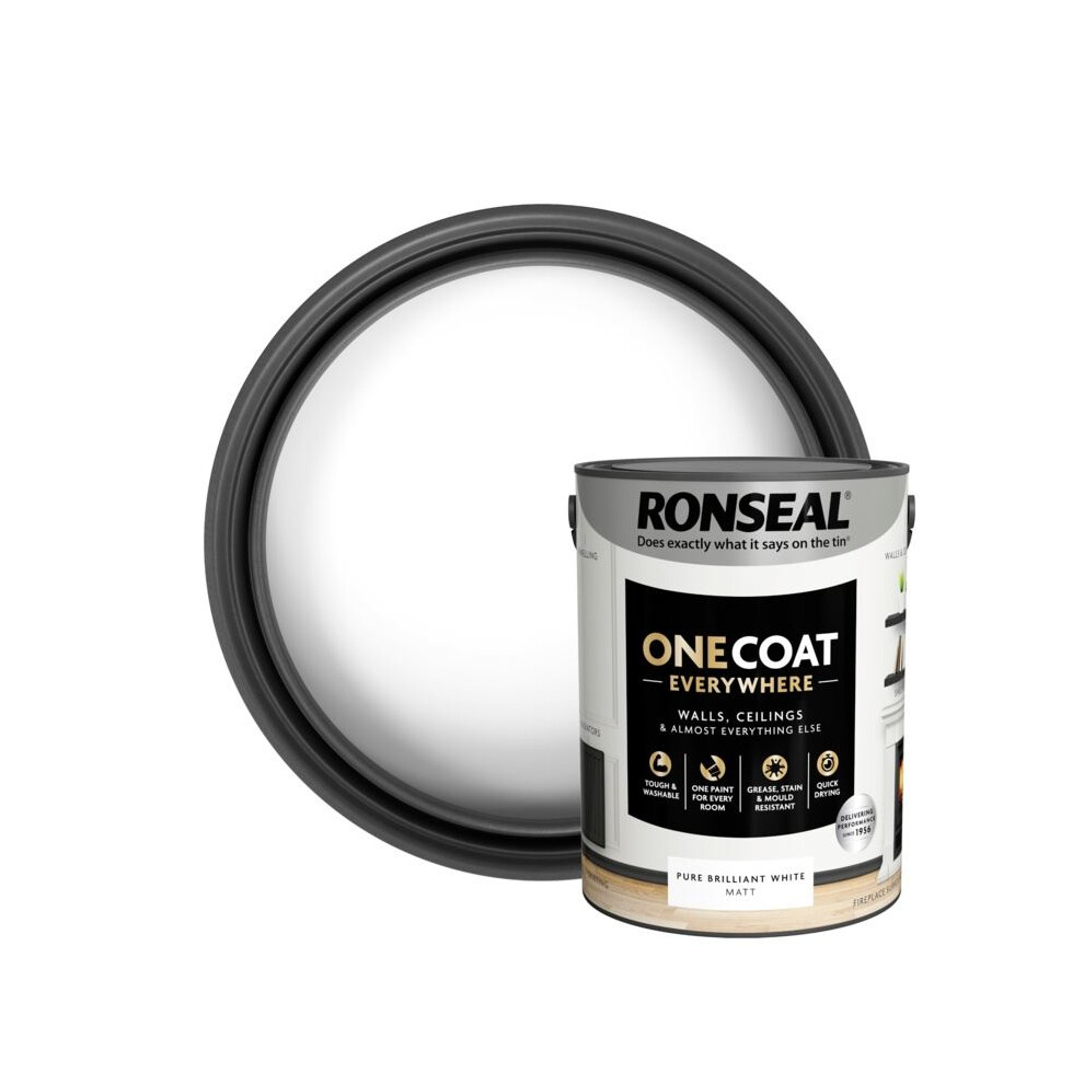 Ronseal One Coat Everywhere Paint Pure Brilliant White Matt 5L – Durable Interior Paint for Walls & Ceilings Smooth Finish Quick Coverage Ideal for Easy Home Projects