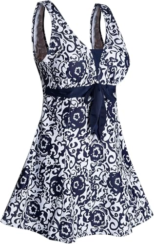 SHEKINI Women's Swimdress V Neck One Piece Swimsuit Tummy Control Bathing Suit Elegant Printed Swimming Costume Padded Swimwear with Shorts Plus Size, Floral Print, Medium