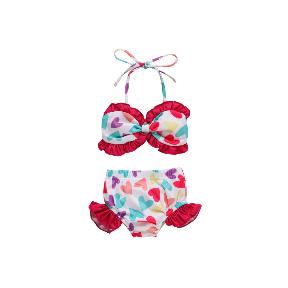 (18-24 Months, Red White 2Pcs) Sister Matching Swimwear, Heart Print Bowknot One-Piece Bikini/Halter Crop Tops and Ruffles Shorts Swimsuit Set