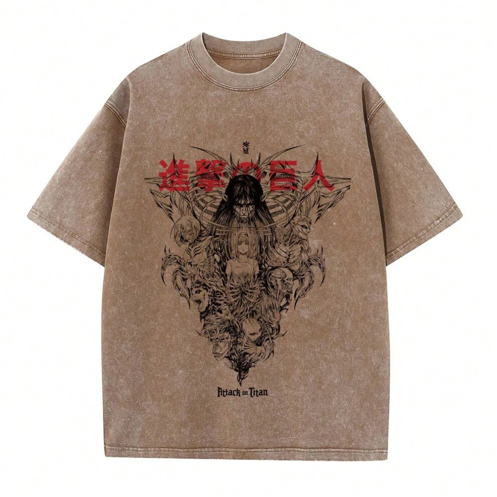 (KhakiJuRen1, M) Men Washed Anime Attack On Titan T-Shirt Hip Hop Streetwear Graphic Print Oversize Tshirt Short Sleeve Cotton Loose Vintage Tops