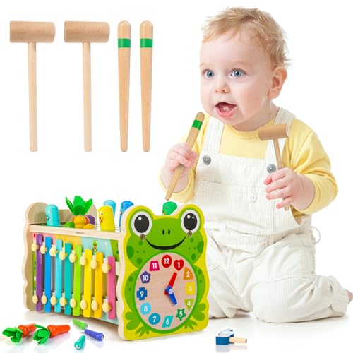 JUSTWOOD Wooden Hammering Pounding Toys, 6-in-1 Whack a Mole Game Early Educational Montessori Toys for 1 Year Old, Birthday Gift for 1 2 3 Years Old Boys Girls