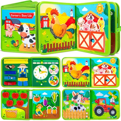 Quanquer Busy Book for Toddlers 1 2 3 - Montessori Toys Farm Busy Board for 1 Year Old Boy Girl Birthday Gift Toys - Interactive Activity Books for Baby - Plane Car Travel Toys with Gift Box