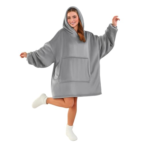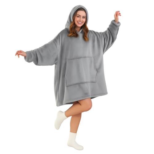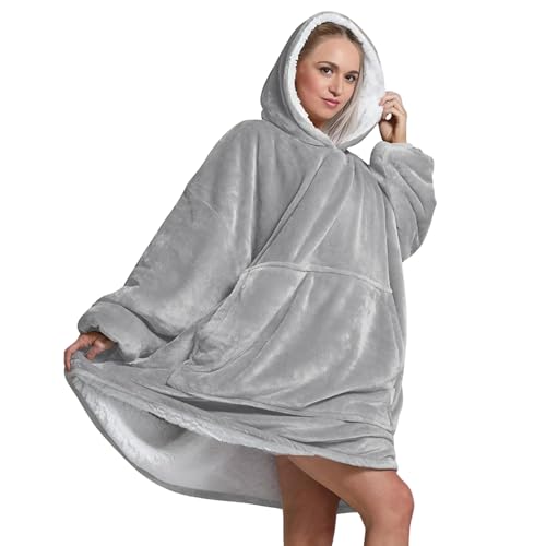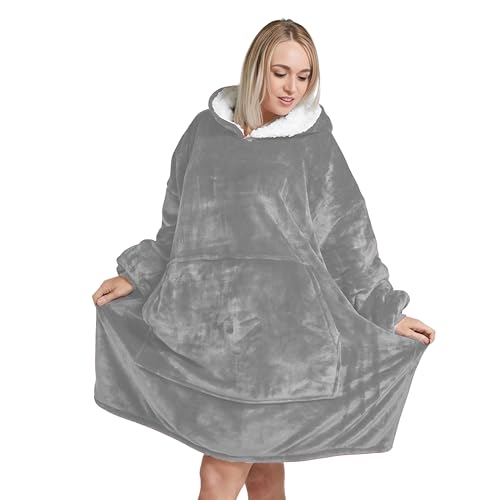 Oversized Wearable Hoodie Blanket Ultra Soft Sherpa Fleece Oodies Reversible Warm & Cozy Giant Hooded Blanket Sweatshirt Large Front Pocket - Gift One Size Fits For All (Solid Color, Light Grey)
