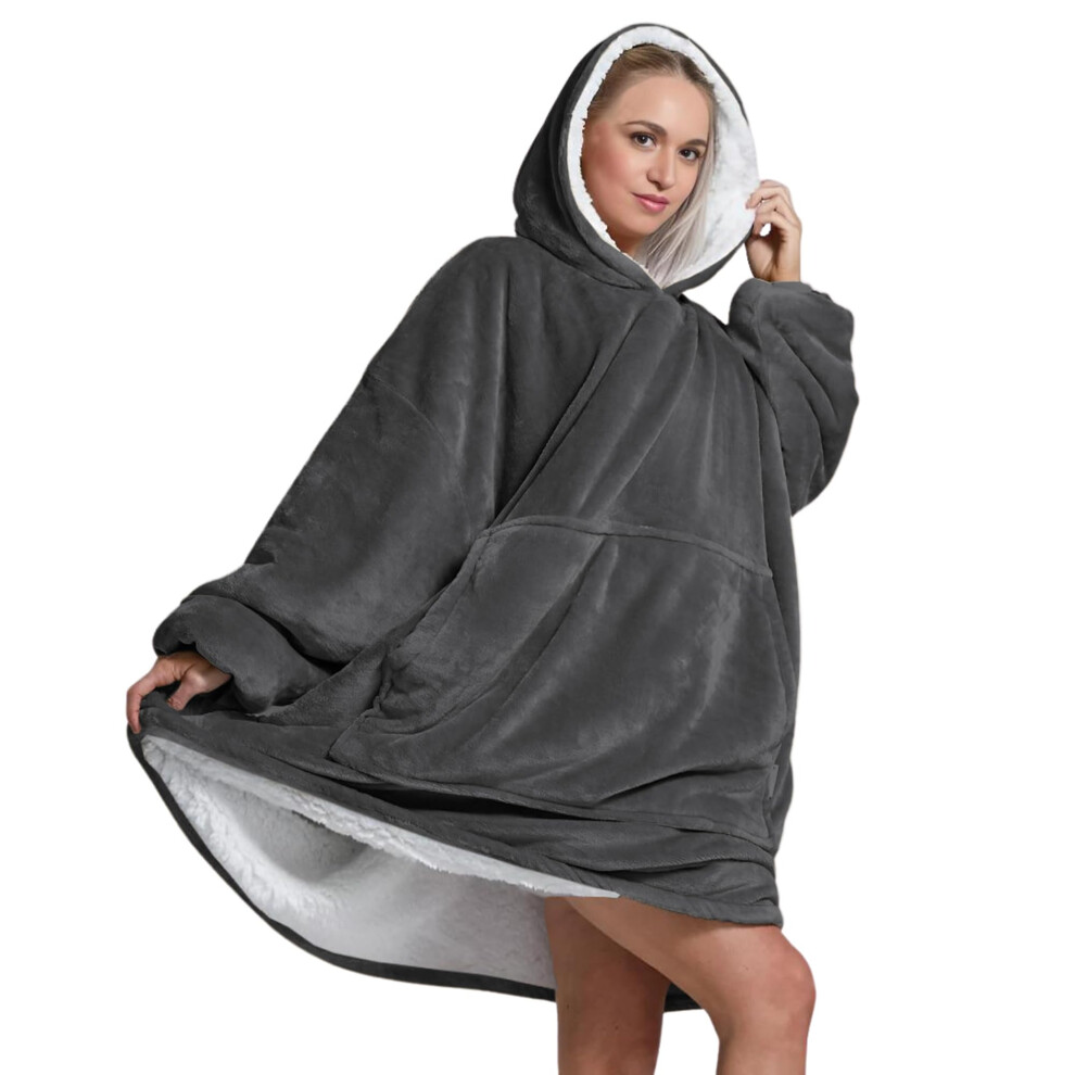 Oversized Wearable Hoodie Blanket Ultra Soft Sherpa Fleece Oodies Reversible Warm Cozy Large Front Pocket Gift Dark Grey