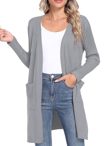 YGJIEGENG Women's Cardigan Summer Long Cardigan Open Front Knit Cardigan Soft Lightweight Cardigan Autumn Winter Elegant Cardigan Sweater with Two Pockets,Gray,S