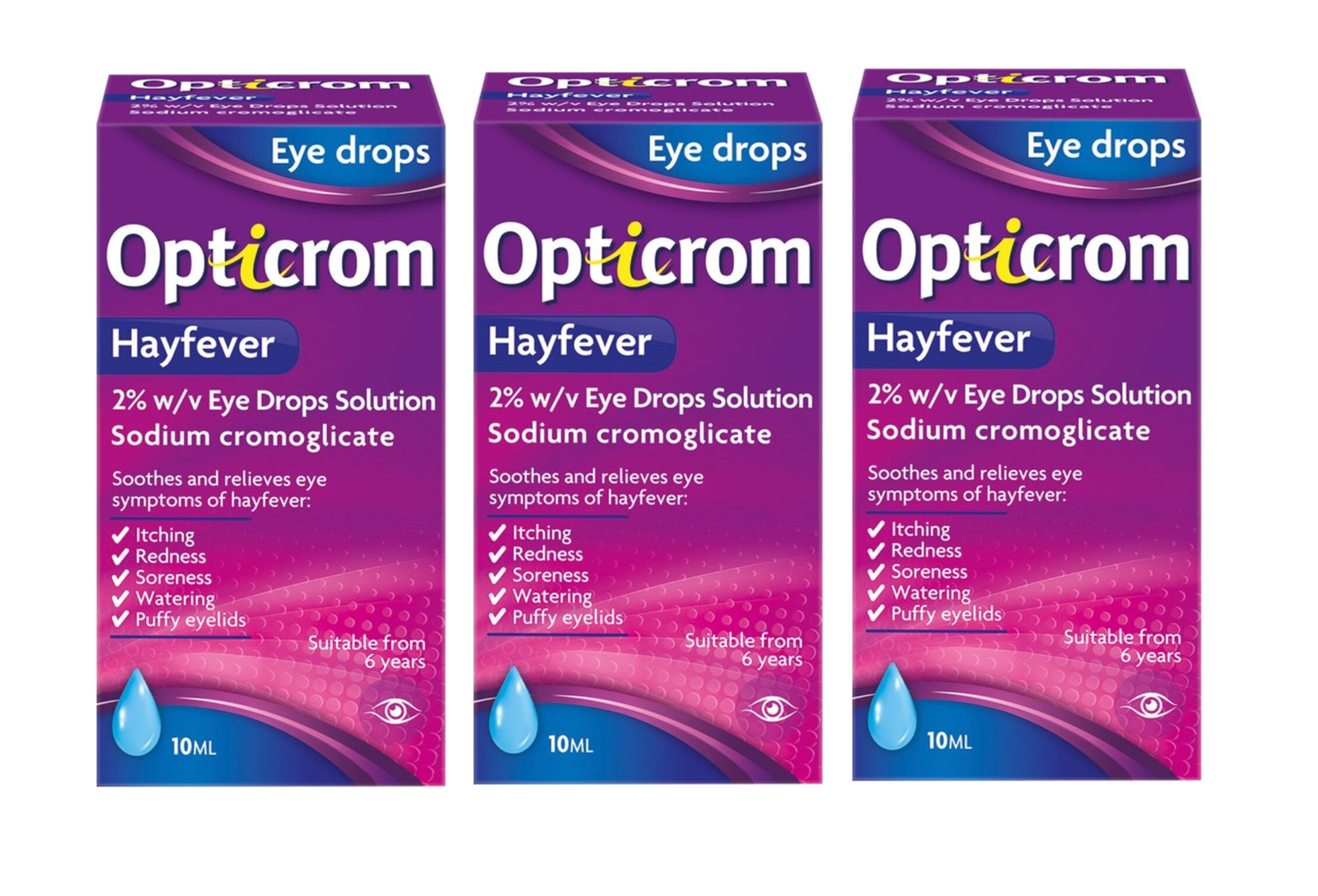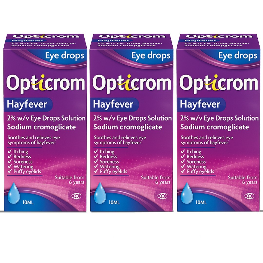 3 PACK Opticrom Hayfever 2% w/v Eye Drops Allergy Itching Redness Watering 10ml