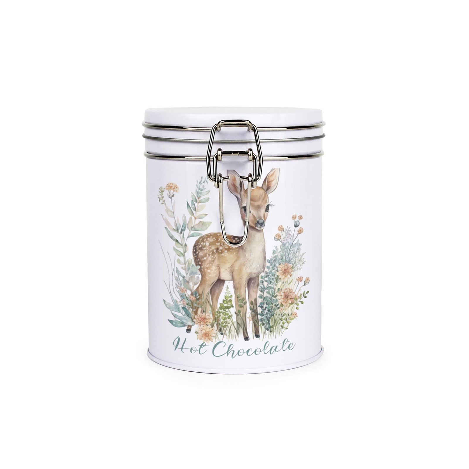 Floral Baby Deer Hot Chocolate Canister - White Metal Clip-Lid Storage Gift