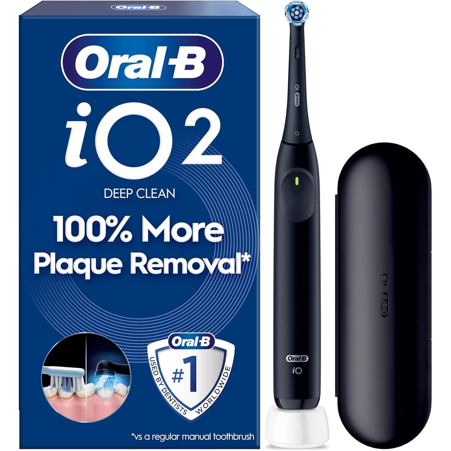 Oral-B iO2 Electric Toothbrush for Adults, Night Black, Long-Lasting Battery for Travel, Includes Gentle Care Brush Head, Travel Case and Refill Holder, Easy Switch to Electric Brushing, 2 Pin Plug