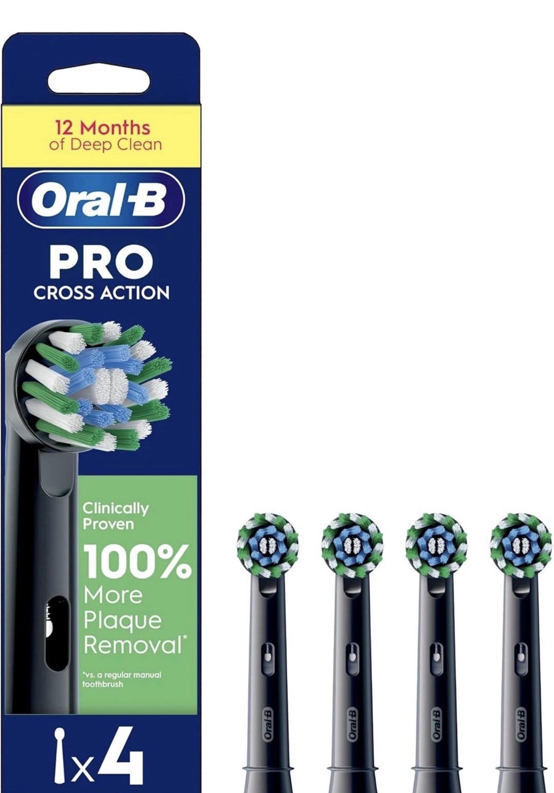 Oral-B Pro Cross Action Electric Toothbrush Head, Electric Toothbrush Heads, X-Shape and Angled Bristles for Deeper Plaque Removal, Pack of 4 Toothbrush Heads, Black, Replacement Heads