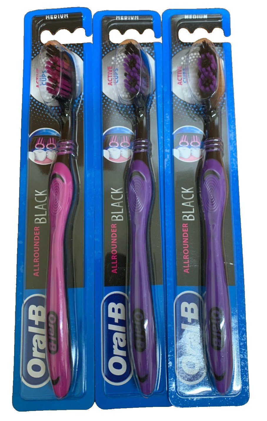 3x Oral B Allrounder Black Manual Toothbrush Active Cups Medium Bristles