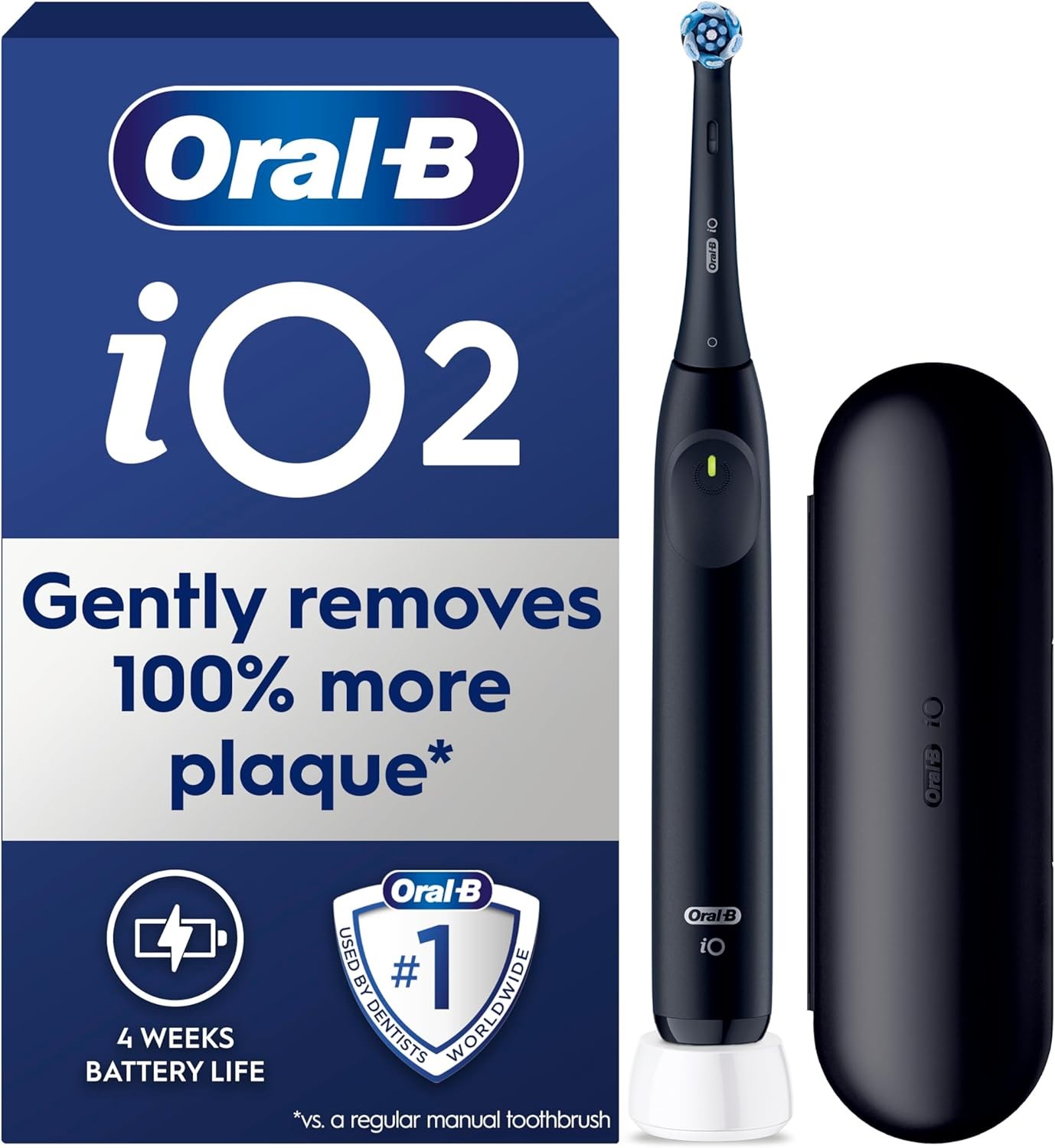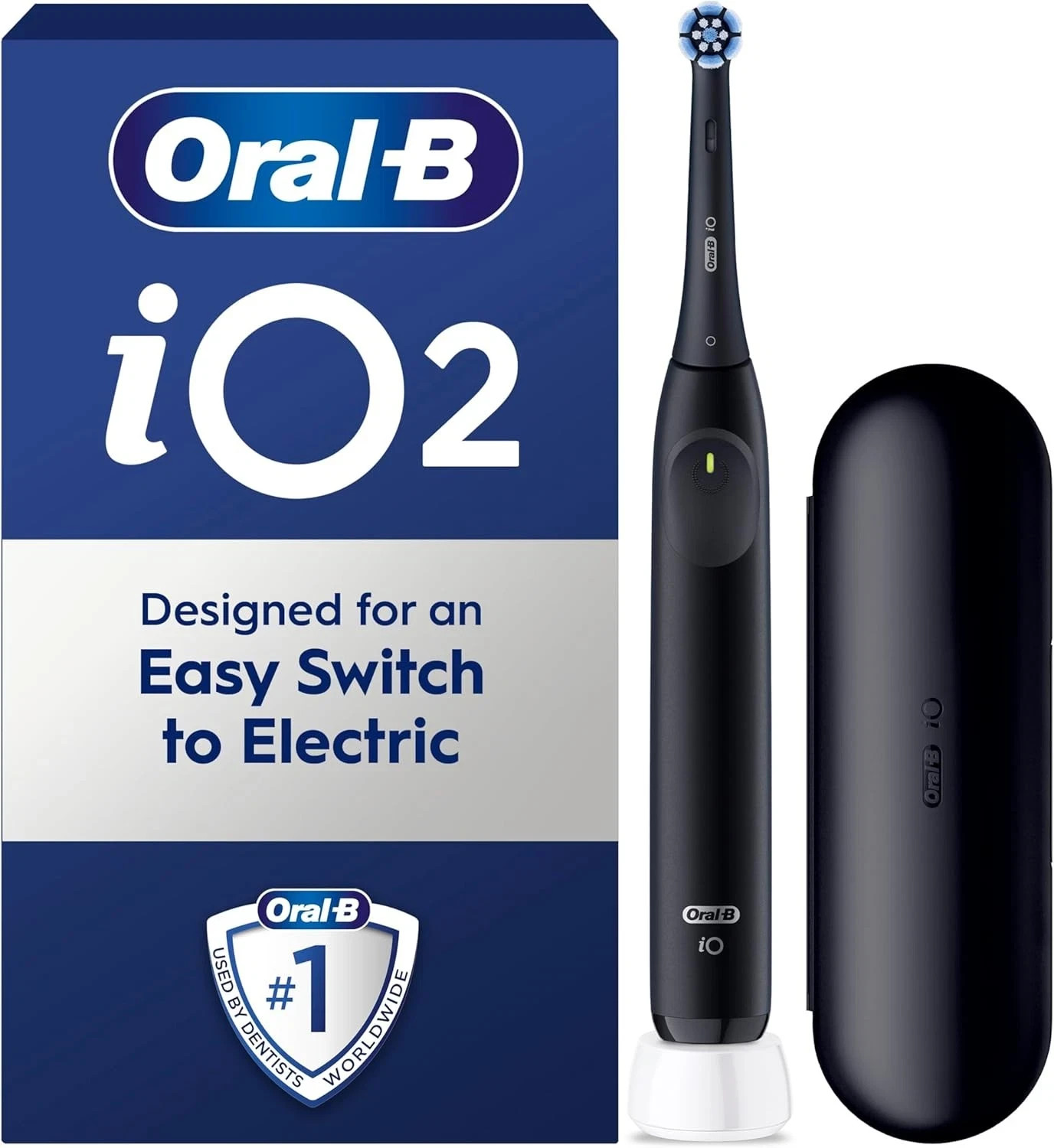 Oral-B iO2 Electric Toothbrush for Adults, Night Black, Long-Lasting Battery for Travel, Includes Gentle Care Brush Head, Travel Case and Refill Holder, Easy Switch to Electric Brushing, 2 Pin Plug