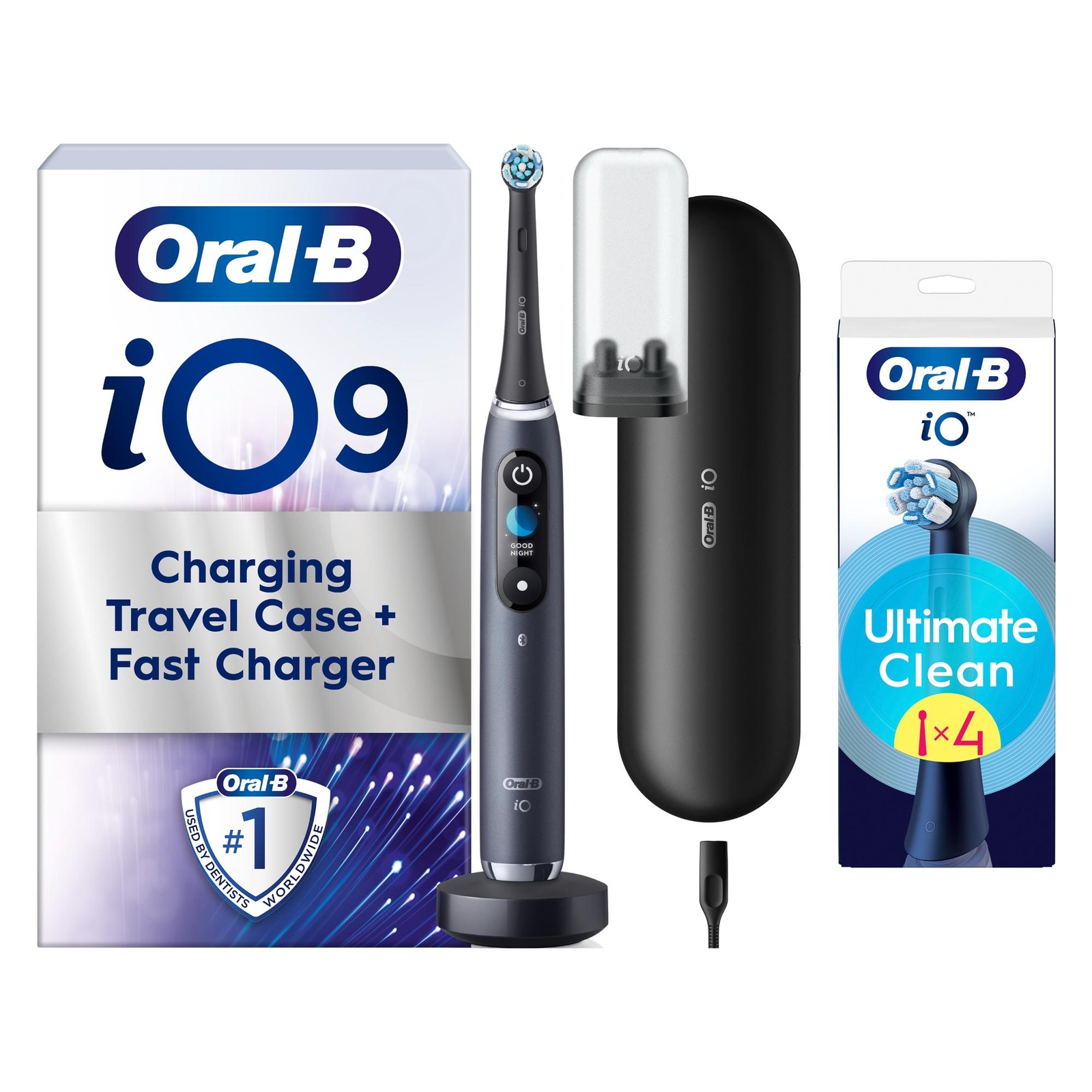 Oral-B iO9 Black Onyx Electric Toothbrush + iO Ultimate Clean Black Toothbrush Heads 4 Pack Bundle