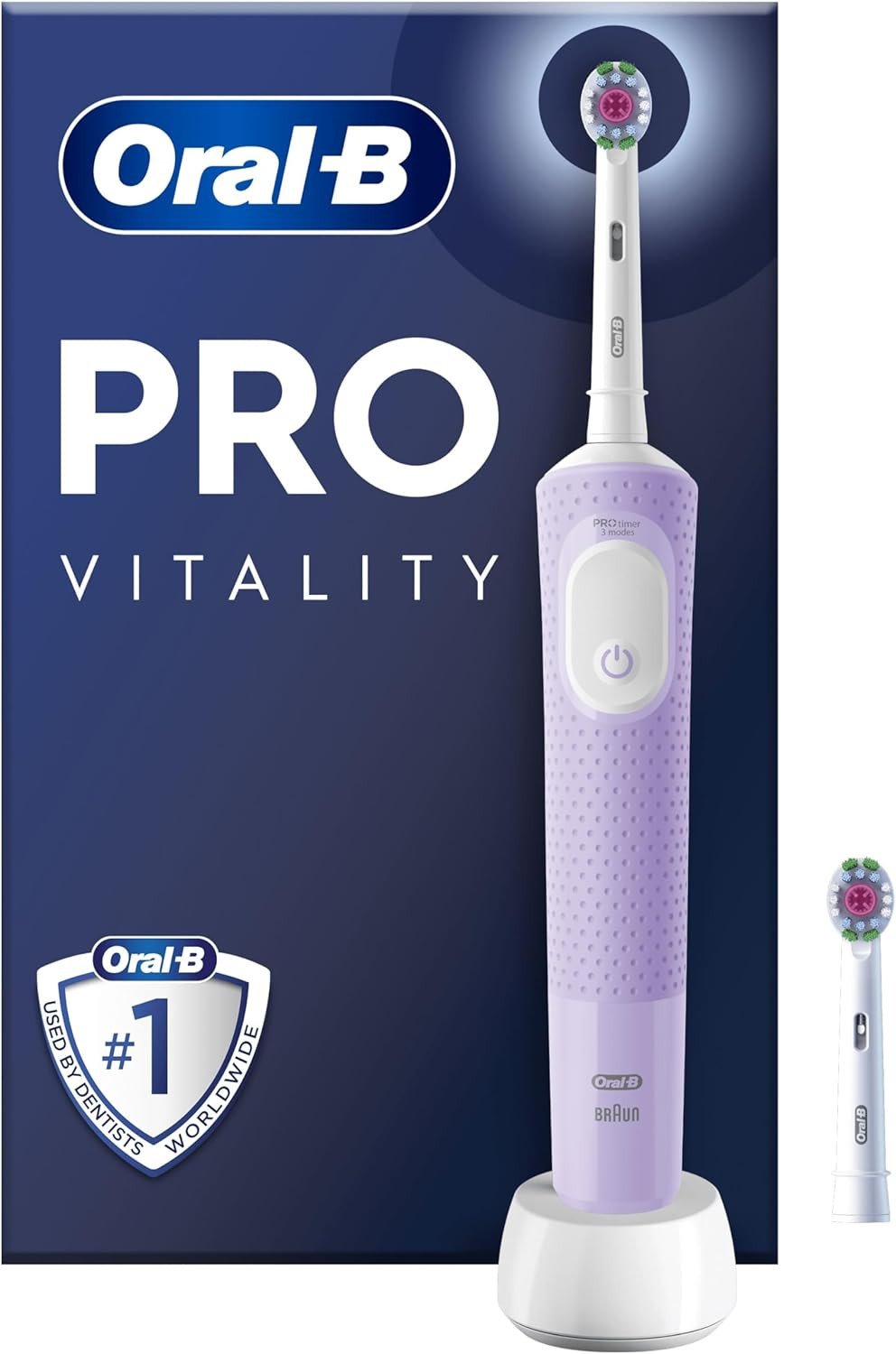 Oral-B Vitality Pro Electric Toothbrushes For Adults, 1 Handle, 2 Toothbrush Heads, 3 Brushing Modes Including Sensitive Plus, Pin UK Plug, Purple