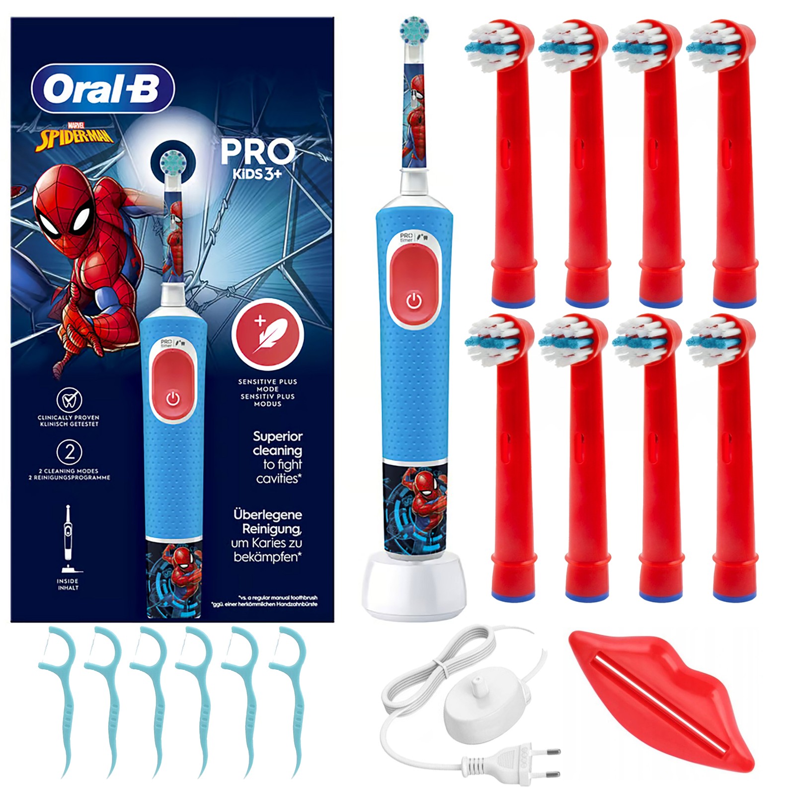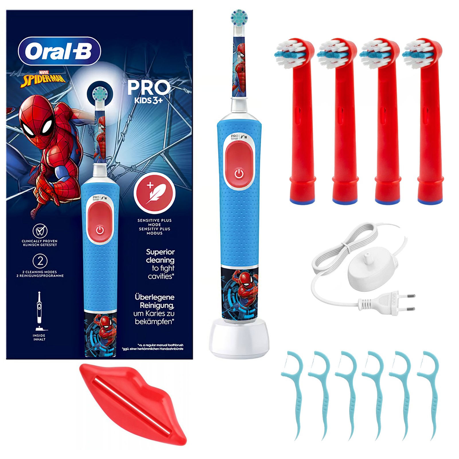 Oral-B Kids Spider-Man Electric Toothbrush (3+): Rechargeable with handle, charger, brush head, 4 stickers; round extra-soft head, gentle mode