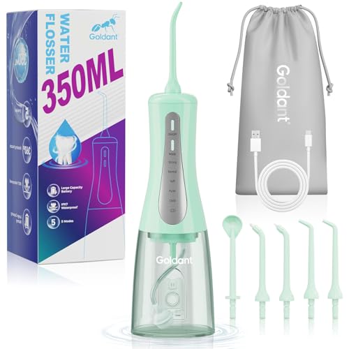 GOLDANT 350ML Water Flosser for Teeth Cordless Dental Pick with Travel Bag, 5 Modes Portable Oral Irrigator Cleaner, Electric Rechargeable IPX7 Waterproof for Travel Home Teeth Cleaning Floss(Green)