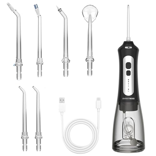 BarberBoss Cordless Water Flosser for Teeth & Gums – 6 Multi-Function Tips, LED Screen, USB Rechargeable, Travel Case Included – Electric Oral Irrigator for Braces, Implants & Gum Health (Black)