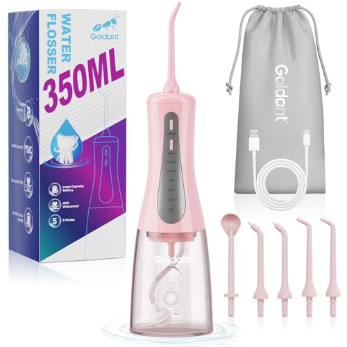 GOLDANT 350ML Water Flosser for Teeth Cordless Dental Pick with Travel Bag, 5 Modes Portable Oral Irrigator Cleaner, Electric Rechargeable IPX7 Waterproof for Travel Home Teeth Cleaning Floss (Pink)