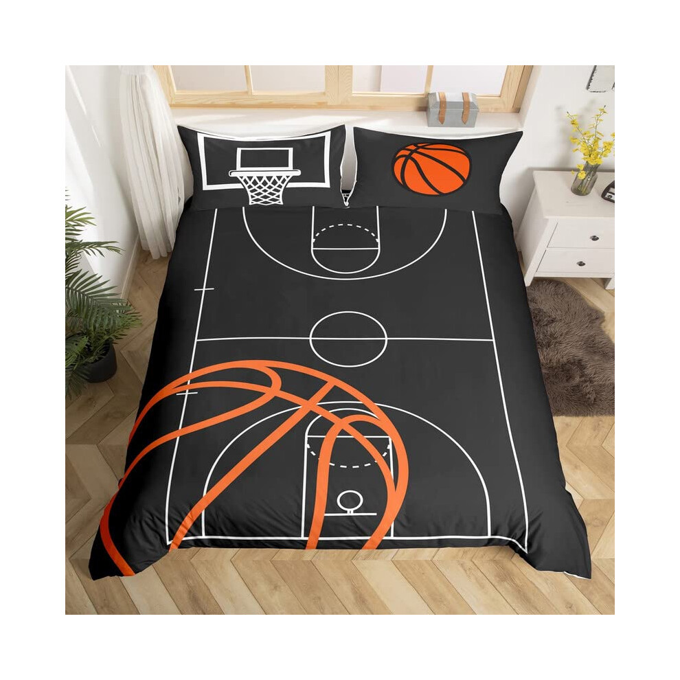 Basketball Court Print Bedding Set Twin Size, Orange Basketball Duvet Cover with 2 Pillowcases, Boys Game Room Decor, Cyjs3028