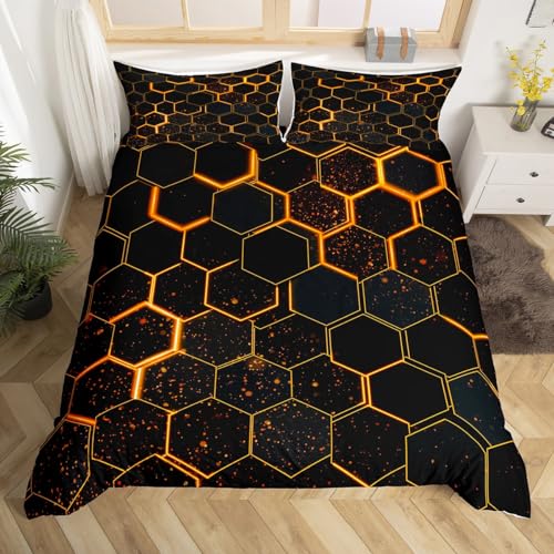 Black Orange Honeycomb Duvet Cover Neon Hexagon Comforter Cover Geometric Beehive Single Bedding Sets for Boys,Abstract Line Art Bed Set Modern Room Decor