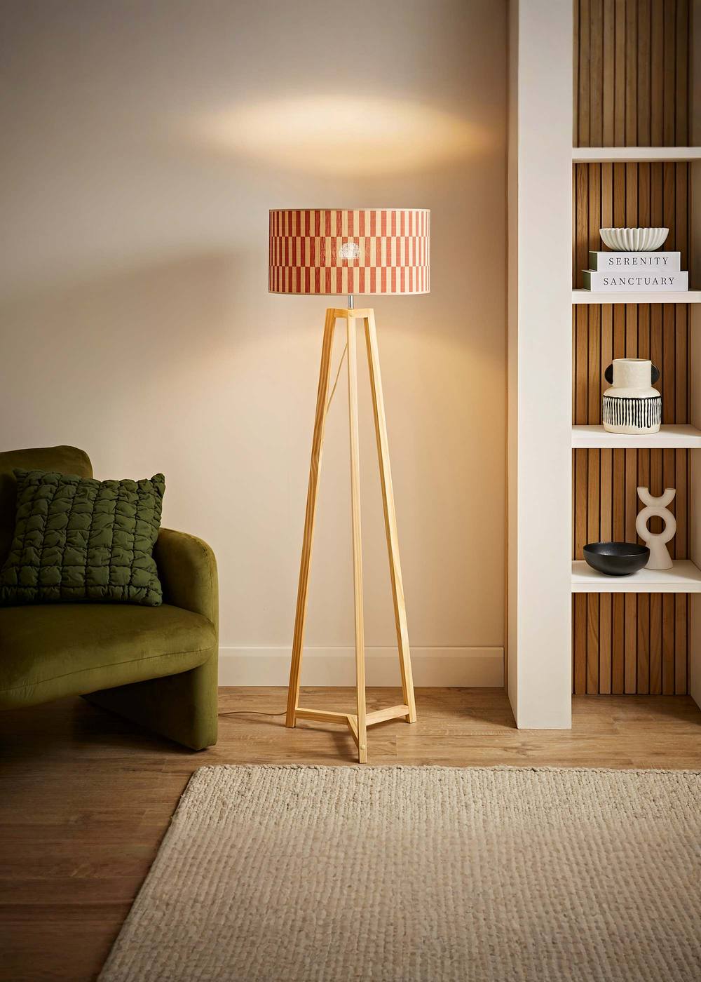 ValueLights Lottie Tripod Wooden Floor Lamp with Orange Checker Bamboo Lamp Shade